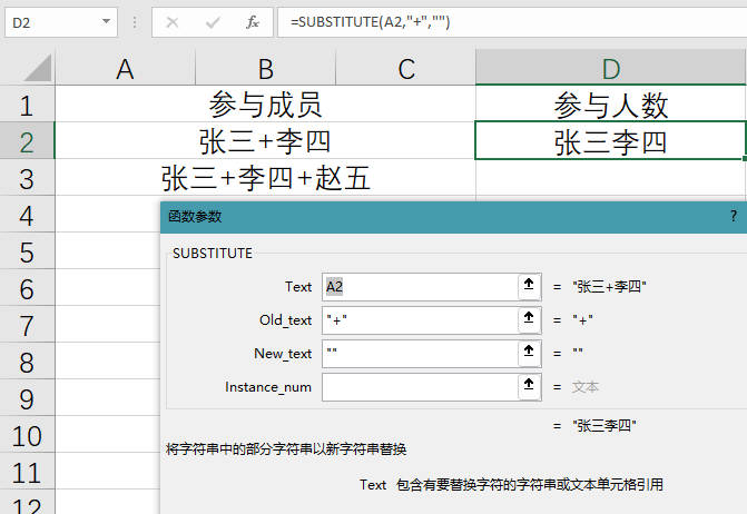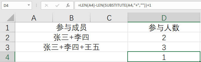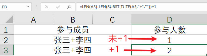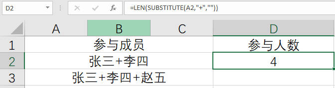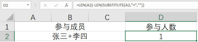 很多情况下,使用Excel需要统计某个活动的参与人数,比如“张三+李四+赵五”统计出来的人数是3个人,如果只有几行的话可以人工统计,但是数据一多就很麻烦,本文将使用LEN和SUBSTITUTE函数进行快速处理。