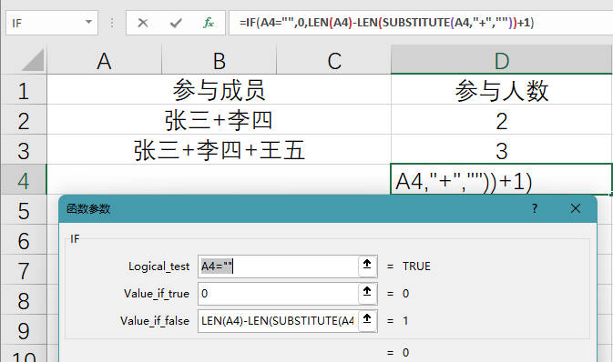 =IF(A2="",0,LEN(A2)-LEN(SUBSTITUTE(A2,"+",""))+1)当单元格为空时,我们直接输出0,否则再用前面所说的方法求人数