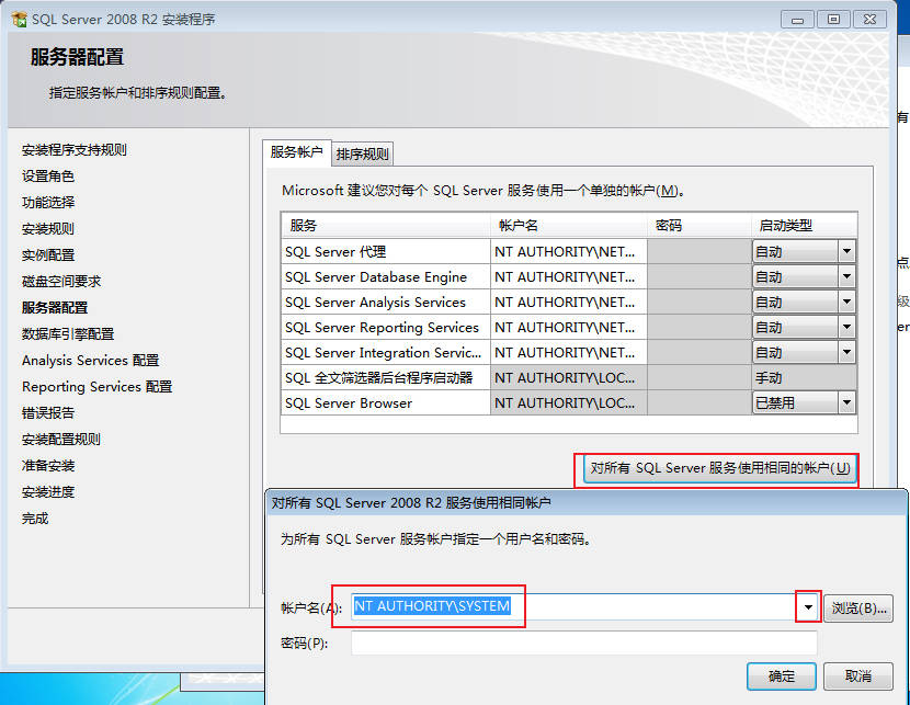 对所有SQL Server 服务使用相同的账户,然后点击小箭头,选择NT AUTHORITY\SYSTEM