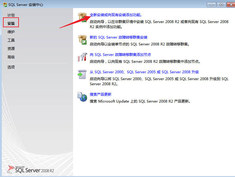 点击SQL server 安装中心左侧菜单栏的”安装”,选择”全新安装或向现有安装添加功能”