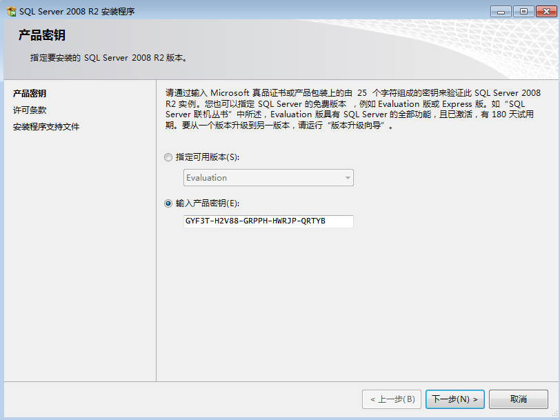 产品秘钥会自动填写,如果没有自动填写请手动填写 GYF3T-H2V88-GRPPH-HWRJP-QRTYB 然后点击下一步