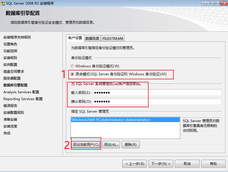 选择混合模式,设置SQL Server系统管理员(sa)账户的密码